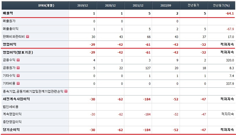 2021년 매출액은 5억원으로 전년대비 4억원 증가하였습니다. 그러나 2021년 영업이익이 마이너스 61억원, 당기순이익이 마이너스 184억원으로 지속적으로 적자를 기록하고 있습니다.