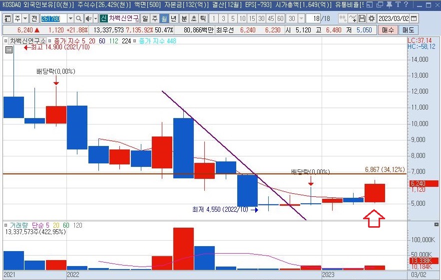 차백신연구소 월봉 차트를 살펴보면 22년 6월부터 하락하던 주가가 5개월 가량 도지형을 포함 단봉 형태 박스권 횡보를 보입니다. 23년 3월에 주가는 22년 9월의 강한 저항대인 6830원 부근까지 올랐습니다.(빨간 화살표)