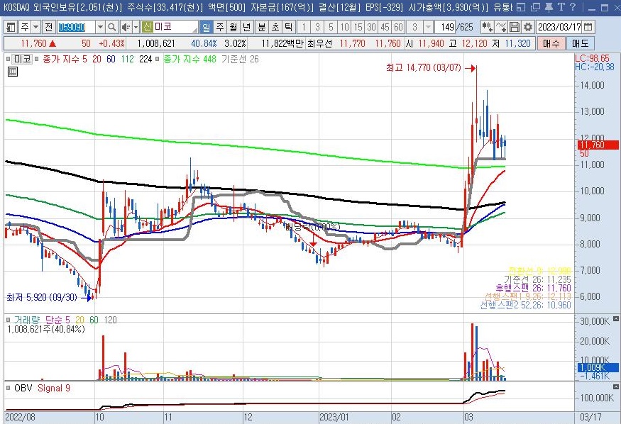 미국 SVB(실리콘밸리뱅크) 파산 소식에 지난 14일 코스피 지수가 2.56% 하락하는 등 출렁였습니다. 주식 투자자들은 당연히 국내외 돌발 악재나 호재를 잘 살피실겁니다. 주식 전문가들 중에는 주가가 전 고점 저항을 받고 하락할 것이라는 예상을 하신 분들도 많았습니다. 대부분 종목이 지수에 따라 움직이지만 갈놈갈(지수에 상관없이 올라 갈 놈은 올라간다)은 있기 마련입니다. 일목균형표 기준선 매매법에 의한 휴맨스 홀딩스 주가전망입니다.