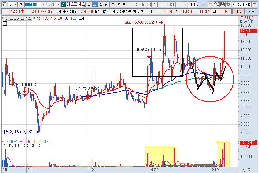 에스피시스템스 주봉 차트를 살펴보면 검은 박스 안에서 주가가 가파르게 급등락한 것을 볼 수 있습니다. 거래량을 살펴보면 주가를 들어 올린 만큼 빠져나간 흔적이 없습니다. 빨간색 타원 안에 역 헤드앤숄더 패턴이 보이며 4주 연속 양봉으로 주가가 상승했습니다.
