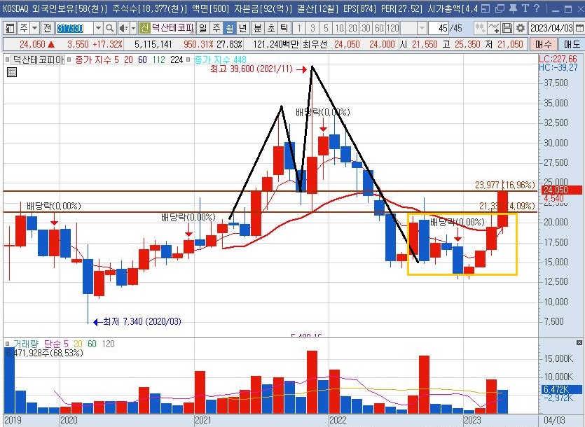 덕산테코피아 월봉 차트를 살펴보면 21년 22년 쌍봉을 패턴을 보이고 22년 6월까지 급락한 것이 보입니다. 22년 7월에 하락에 브레이크를 거는 단양봉이 출현한 후 박스권을 그리다가 2023년 4월 박스권을 돌파하는 장대 양봉이 섰습니다.