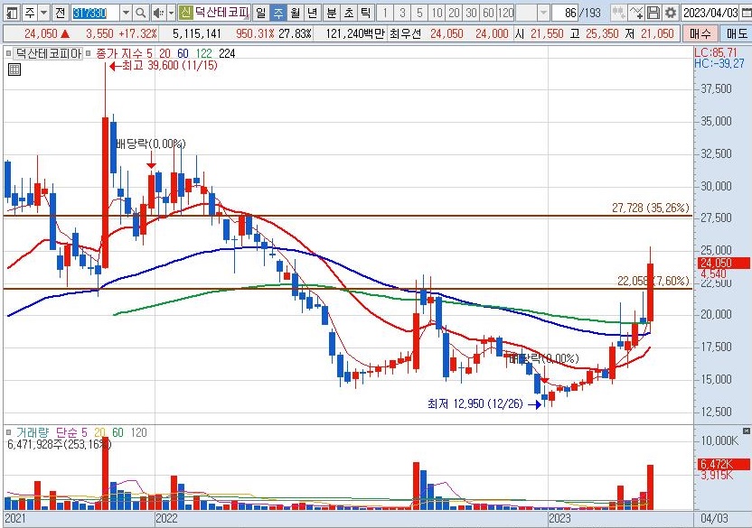 덕산테코피아 주봉 차트를 살펴보면 마지막 장대 양봉이 시원스럽게 전고를 뚫었습니다. 주봉 상 60이평(파란색)과 112이평(초록색)은 역배열 상태지만 5이평(빨간색 가는선)이 20이평, 60이평, 112이평을 차례로 골든 크로스했습니다.