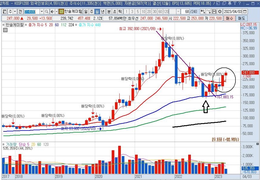 한솔케미칼 월봉 차트를 살펴보면 2021년 9월부터 하락 추세를 그리던 주가가 2022년 10월에 월봉 상 60이평(파란색) 지지를 받는 양봉으로 하락세에 멈췄습니다.(검은 화살표) 2023년 3월에 장대양봉으로 5이평과 20이평 골든 크로스가 되었습니다. 4월 현재 20이평을 지지 삼고 있습니다.