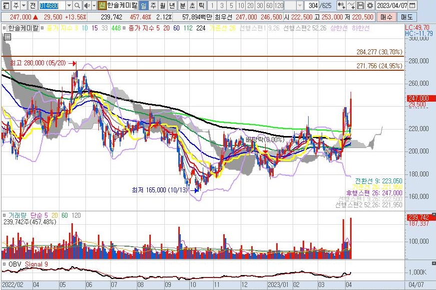 한솔케미칼 주봉 차트를 살펴보면 2022년 10월부터 저점을 높이고 있습니다.(보라색 직선) 2023년 3월 넷째 주에 노란 박스권 상단을 뚫어올렸습니다. 주봉 차트 상 다음 저항대는 271,000원입니다.