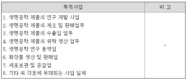 에스바이오메딕스는 줄기세포치료제의 개발 및 제조를 전문으로 하는 바이오 제약사이며, 영위하는 목적사업은 다음과 같습니다.