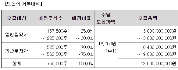 공모 물량 총 750,000주 중 기관투자자에게 525,000주 ~ 562,500주(70.0% ~ 75.0%)가 배정됩니다. 일반청약자 물량은 공모주식의 25.0% ~ 30.0%인 187,500주 ~ 225,000주가 배정됩니다.